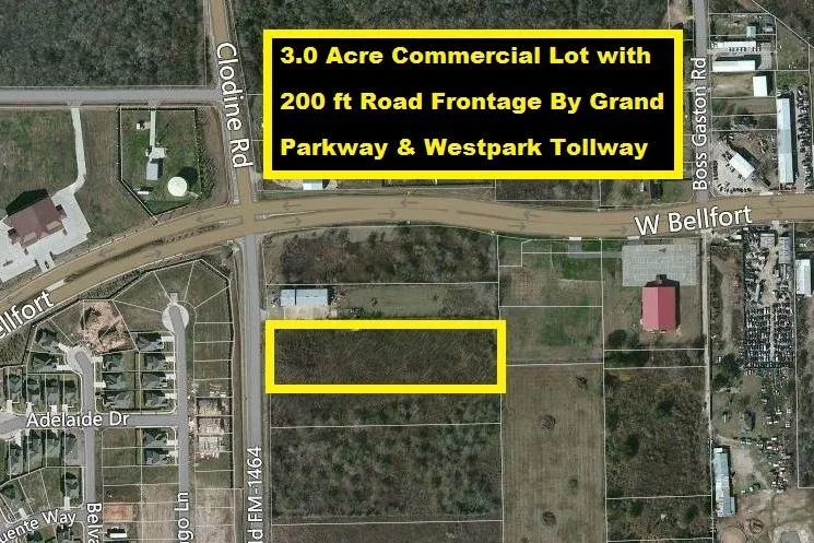 Seller Financed! Cleared 3.0 Acres by W Bellfort w/197 ft Clodine Road Frontage. Close to TX-99, West Park Tollway & TX-6. Minutes to Schools, Sugar Land, Richmond & Parks. 30 Miles to Downtown Houston, TX Medical Center & 3 Universities. Surrounded by residential properties makes it a prime location for a Church, Retail Center, Medical/Dental Clinic, Office/Warehouse, Urgent Care Facility, Business Center, Gas Station/Convenient Store, Restaurant, Drive-Thru or Animal Clinic. Adjacent 2 Acres is also available for sale either separately or combined for a total of 5 acres! All Utilities!