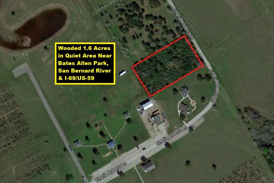 Wooded 1.6 Acres w/200 ft Charlie Roberts Lane Road Frontage in Quiet Area Near Bates Allen Park, San Bernard River & I-69/US-59. Property Borders the Bates Allen Park which is on the San Bernard River at the end of Charlie Roberts Ln with Parking Lot only 0.5 Miles Away. The Park has 2 Pavilions w/Tables & Grills, Restrooms, Playground Area, Fishing Pier, Lake Stocked w/Catfish & Rainbow Trout, Observation Deck, Canoe Ramp for the River, Sand Volleyball Court, Walking Trails, Wetlands & the Fort Bend County Heritage Unlimited Museum Historic Site. Less than 30 Miles to TX-99/The Grand Pkwy & Sugar Land. 45 Miles to Texas Medical Center & Downtown Houston. Perfect Location for Single-Family Home so Close to the Park, San Bernard River & I-69/US-59. Needs Well & Septic System Installed. Property is Located Across from 539 Charlie Roberts Lane. TX-99/The Grand Pkwy (Houston's 3rd Loop) will span 180+ miles from League City-Rosharon-Katy-Tomball-Baytown (See Map)!