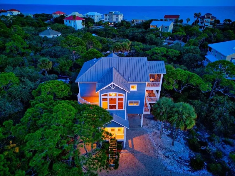 Direct Beach Access Heated Pool Gated Community. Refined coastal living awaits in The Plantation on St. George Island. This custom-built 4-bedroom, 4.5-bath home in the exclusive Sea Palm Village enclave blends elegant design, functional comfort, and a seamless connection to the Gulf of Mexico. Positioned for both privacy and Gulf views, the open-concept main level features a bright living and dining area with vaulted tongue-and-groove ceilings, expansive windows, and natural light that enhances the home's coastal aesthetic. The kitchen offers stainless-steel appliances, granite countertops, and a breakfast bar ideal for gathering. Downstairs, a fully equipped wet bar and lounge open directly to the pool terrace—perfect for entertaining or relaxing after a beach day. Three guest suites on the first floor each offer private deck access, while the upper-level primary suite captures Gulf views and coastal breezes. Step outside to your private outdoor oasis featuring a 15x32 heated pool with waterfall, surrounded by a paver patio, lounge seating, and a fish cleaning station. A paver walkway leads directly to deeded beach access, connecting you to the shoreline in minutes. The Plantation community offers a private airport, two resort-style pools, pickleball and tennis courts, fitness center, kayak launches, and miles of scenic bike and nature trails. Residents enjoy exclusive access to both Apalachicola Bay and the Gulf, creating endless opportunities for recreation and relaxation. Whether you seek a primary residence, vacation retreat, or luxury income property, this home defines refined coastal living on one of Florida's most treasured barrier islands.