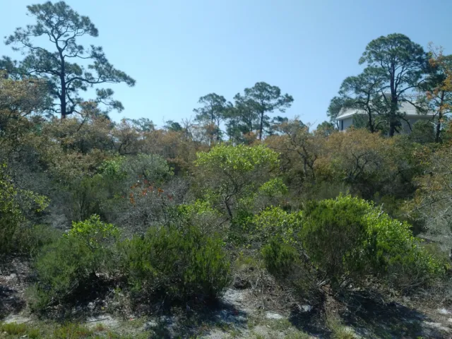 Beautiful, high, dry corner lot with mature vegetation. Easy access to beach, air strip, tennis courts, clubhouse and pool. Bay front property across the street is owned by the State and has a kayak launch. Gulf and bay views may be possible from a multi-level home on pilings. The Plantation is purchasing the large pool at Resort Village which is within walking distance. House can be positioned so that you can look straight down Nick's way toward gulf.
