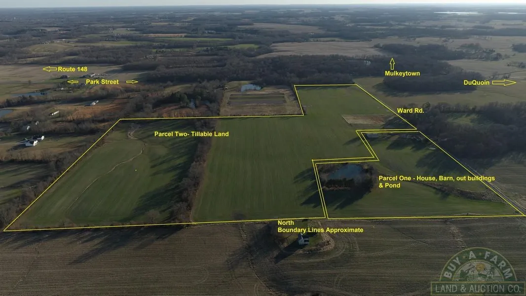 Tract One consists of 13 surveyed acres including the home, outbuildings, barn and pond. The two-bedroom, one-bath ranch-style home with large country kitchen has full basement. Living area consists of 1150 square feet. New roof in 2019. Home has central air and gas furnace with 500 gallon propane tank that is owned and full. There is a spacious two-car detached garage. Termite inspection is transferable. Basement walls had been repaired and there is a transferable warranty. A back patio overlooks the fields and picturesque pond that is stocked and surrounded by trees and benches; a beautiful park-like setting to spend quiet summer evenings. This is a perfect small farm home place with so many options for country living. There is enough land to raise a few head of horses and other livestock. There is a smaller outbuilding used to raise pigeons that can be easily converted for chickens. The 50 x 60 ft. pole barn with electricity is in excellent condition and was used for livestock, storing hay, equipment and workshop area. A portion of this 13 acres is currently being farmed and can be continued to be farmed, adding some additional income. It is rare to find small acreage country homesteads, especially with all that this one has to offer.