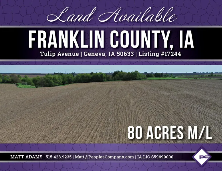 Peoples Company is pleased to present 80 acres m/l of Franklin County farmland located approximately 2.5 miles northeast of Geneva, Iowa, and 10 miles southeast of Hampton, Iowa. The farm includes 60.75 FSA tillable acres with a CSR2 rating of 54.9. Located on the Northeast corner of the property are 2.61 acres of CRP, enrolled in CP-42 (Pollinator Habitat) which pays $204 per acre or $532 annually. This would make for a great add-on unit to an existing operation or an affordable purchase for a Beginning Farmer / Investor. The property also offers a recreational component of over 10 acres m/l of timber draws with a creek bed flowing north into Maynes Creek. The farm is located in Sections 15 & 16 of Geneva Township.