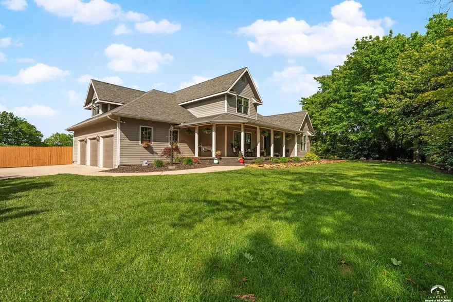 Tucked at the end of a quiet cul-de-sac in Wheatland Farms, this beautiful custom home sits back on approximately 3.6 acres. A peaceful wraparound porch sets the tone before stepping into a two-story foyer with a gorgeous wood staircase and formal living and dining rooms on either side. Toward the back of the home, you'll find a vaulted family room that opens to a kitchen with granite countertops, alder wood cabinets, an island, and casual dining perfect for gathering. The spacious primary suite is located on the main level, with three additional bedrooms and an office upstairs. Just off the living room, a screened-in patio overlooks the enclosed backyard. Beyond the gate, a groomed path winds through native prairie grass and leads to the private community pond. The finished basement offers a rec room, safe room, generous storage, and room to expand. An extra-large mudroom off the 3-car ...