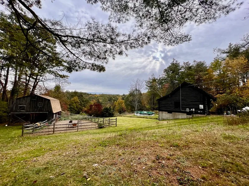 Welcome to Your Idyllic Log Cabin Farm on 23 Acres! This charming cape-style log home presents a first-floor master suite, a cozy living room with a fireplace, and a classic log interior. Recently renovated, it boasts a modern kitchen and bathroom, along with two full baths and upgraded Pella windows. The full walkout basement offers an excellent workshop and storage space. You'll find the warmth of wood heat with a pellet furnace and stove, along with upgraded solar and a side panel for a portable generator. Outside, the property features a two-box stall barn with a paddock area and a 5,000 insulated retrofit chicken coop, an open field, above-ground pool, woods, pollinator meadow, trails, and a serene stream. Take in the picturesque surroundings from your private back porch, overlooking your little ranch/farmette. All exterior lighting and gutters on house and barn are new. Too many up...