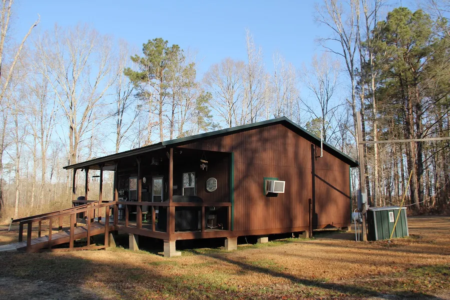 This is your chance to own an awesome hunting tract with two cabins ready to move in. The main cabin is two bedrooms & 1 bath with an open living room and kitchen. The guest cabin is one bedroom, bath, and kitchen. Both cabins have a direct view of the stocked pond and share a pavilion for after the hunts. There is also a bar-b-que pavilion just off the front of the main cabin to cook up some good meals. There is an equipment shed to keep all the equipment that the seller is leaving behind, such as a 39 HP Kubota tractor with all implements, two golf carts, and a four-wheeler. There is a generator on-site to keep the electricity up and running. The grounds is prime deer habitat with four food plots with box stands and feeders on each. The owner has thinned out most all the pine and gum trees and has left all the acorn-bearing trees for the game, which has opened up the forest floor to le...
