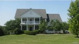 When only the best will do! Be impressed as soon as you drive up to this lovely Southern Style Two Story Estate located on 5 acres, adjoining Wolf Hollow Golf Club, minutes off I-44 in the Washington School District. Entering this lovely home, you will be greeted with a custom curved wood stair case, split front and back to kitchen, and wood floors throughout entire home. There are double antique stained glass doors to the den, which can serve as a main floor master suite, with it's own full bath. Impressive room sizes, and well positioned windows, offers a comfortable and light living experience. Each of the upper 4 bedrooms and staircase landing, are unique in character. Master suite with double door entry, rear balcony offering views of the fantastic countryside, ventless gas fireplace, two walk in closets, and luxurious bath! Another is an art studio w/vaulted ceiling. Laundry is loc...
