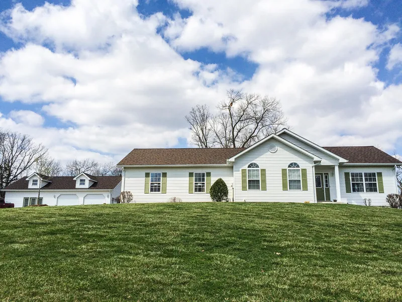 The main home's large windows radiate light throughout the main living areas on both levels, and provide a mesmerizing view of Missouri's rolling landscape. Upstairs you will find the master suite, half bathroom, kitchen, and an attached 2.5 car garage with built in cabinets and a custom built engine lift, and downstairs provides two more bedrooms and bathroom. The lower level's walkout basement and patio with a hot tub make it a great space for entertaining.