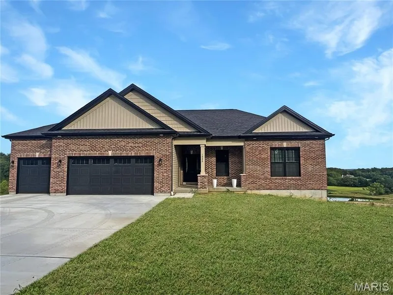 Stunning views at Stone Bridge! Experience luxurious main-floor living in this new home in Washington, offering breathtaking scenic views from your covered back deck. Designed with comfort and elegance in mind, home features an open floor plan, high-end finishes, and spacious rooms perfect for easy, single-level living. Relax and enjoy the beautiful surroundings from your private residence, with plenty of natural light and modern amenities throughout. Three car garage w/ added depth for larger vehicles, three bedrooms, two baths and spacious great room. Stone fireplace surrounded by oversized windows provides plenty of light. The kitchen shows quartz countertops, large island w seating area, 42" upgraded soft close cabinets, and the breakfast room walks out to a covered deck. 10' ceilings in the great room / kitchen, 9' ceilings throughout, LVP flooring, modern black hardware and upgraded lighting, upgraded stainless appliance package. Open staircase w/ wrought iron spindles. Master suite w walk in shower, double bowl vanity, linen closet and separate commode area. The walk out lower level is set up for future expansion, including a rough in for the bathroom and 8'10" concrete pour for easy finish.