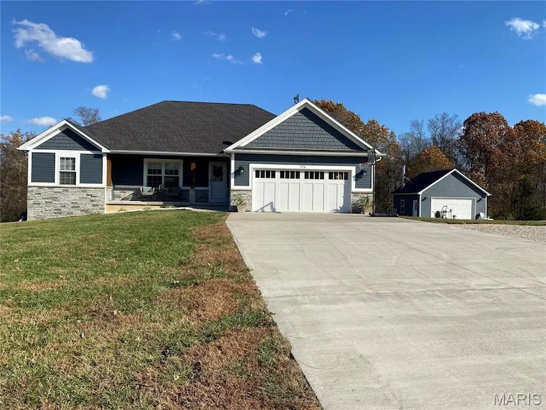 Discover this beautifully designed 5-year-old Craftsman-style Ranch home set on approximately 10 acres of a perfect blend of open land and mature woods. This property offers privacy, serenity, and an array of features ideal for everyday living, entertaining, and enjoying the outdoors. As you arrive, the charming curb appeal immediately stands out. A large, inviting front porch overlooks sweeping views and provides an ideal spot to unwind and watch the sunsets. Walking from the driveway to the front door, you are welcomed by the spacious porch that leads into the bright and open main living area. The Great Room, Kitchen, and Dining space are unified by a vaulted ceiling that enhances the light-filled, airy atmosphere. The open floor plan is ideal for modern living, providing excellent flow for gatherings and daily comfort. The divided-bedroom layout offers privacy for the main bedroom suite, which features a coffered ceiling, raised double vanity, a large walk-in tile shower with a daylight window, and a roomy walk-in closet. On the opposite side of the home, you will find two additional bedrooms, both generous in size, and a full hall bath with a convenient tub/shower combination. The lower level is fully finished and provides fantastic additional living space. Perfect for movie nights, hosting friends, or watching your favorite sports, this area is designed for relaxation and fun. There is also a guest bedroom for guests, a full bath with tub/shower, and a rough-in for a future bar if desired. A large storage area that ensures plenty of room for seasonal items and household extras. The walkout leads to a patio that connects via sidewalk to the detached garage/shop 24X24, offering both convenience and functionality. Outdoors, the property offers a wonderful mix of open ground and wooded acreage. Trails wind through the timbered areas, leading to a wet-weather creek ideal for exploring, ATV rides, or simply enjoying nature. Whether you prefer open yard space, quiet wooded retreats, or scenic paths, this property has something for everyone. A Perfect Place to call HOME! Coming Soon Nov. 22nd.