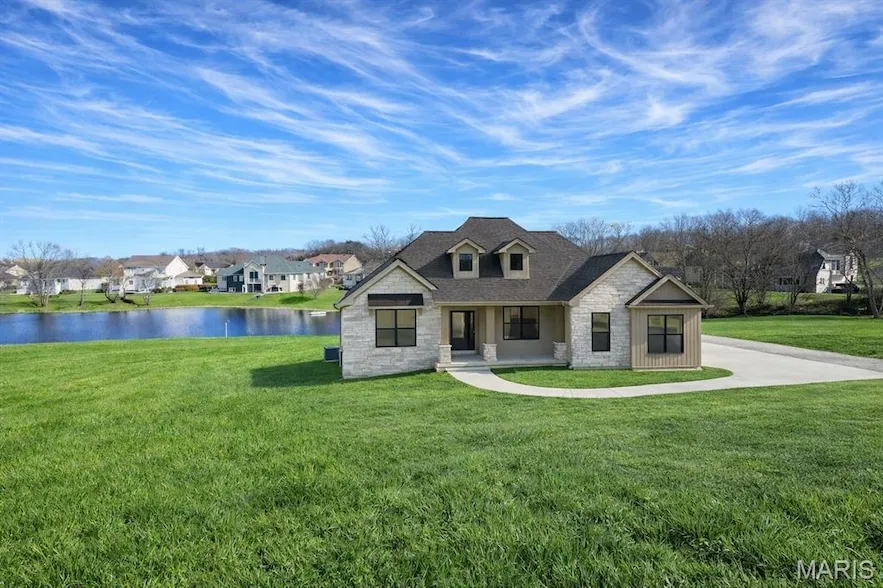 New Home on the water at Cobblestone Creek. Take in the view in your new home by Northern Star Homes at the last lake homesite! Here's the highlights of this floor plan: 4 main floor bedrooms + study, an open design with expansive windows, covered deck and expansive patio. The finished lower level adds a rec room and bedroom, full bath and bar. Walk out to you oversized patio at the lower level. High ceilings, built ins, stone fireplace, upgraded flooring, upgraded trim and interior doors, Diamond level cabinets with oversized island, quartz tops, upgraded appliances with double wall oven, gas cooktop, added drawers, walk in pantry. Master suite features a tile / frameless glass shower, separate soaking tub, double vanity w quartz, linen closet and walk in closet. Main floor laundry with cabinetry. Drop zone at entry. The elevation planned shows off brick / stone, hip roof, side entry garage, and dormers. Buyers will choose exterior and interior colors. Northern Star Homes will make some design variations and customizations. Northern Star Homes is your hometown builder in Washington, Missouri. Cobblestone Creek is located just outside of Washington and is a premier community with large homesites. More models are available to view at Stone Bridge (located just off Bieker Road).