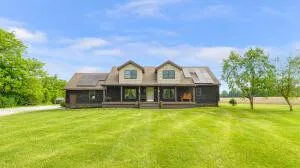 Open house Sunday 2-4pm, June 6th. Full cut log home w/exposed wood logs and beams throughout home w/four huge bedrooms, all vaulted with exposed beam ceilings and skylights. Also, bonus room finished over garage could be 5th bedroom. Huge 5-acre lot with area to fence for pasture,, build a pole barn or just let grow. Very private. Property goes all the way back to the corn field...5 beautiful country acres. Full basement w/cellar door exterior entry, side load 2 car garage, front and rear covered porches, Traditional floor plan w/large living room, office/den, huge family room, formal dining area, large country kitchen loaded with cabinets & stainless steel appliances. 6 panel wood doors, water filtration system. Owner has done many updates, solar panels 2015 too! Come see today!'