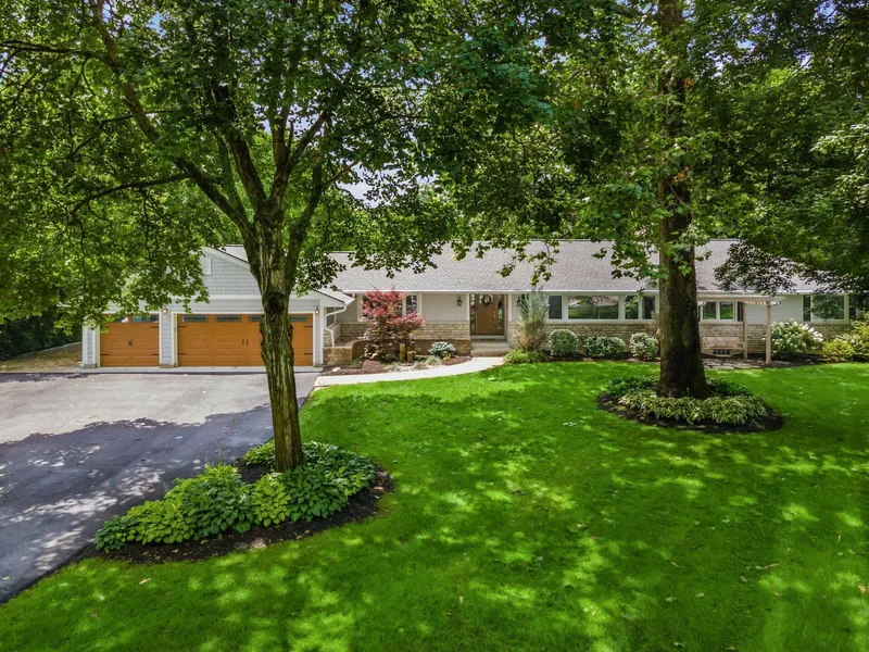 Country retreat living in the city! Beautiful one story home features open floor plan with newer chef's kitchen. Family room has floor to ceiling stone fireplace and walls of windows overlooking the pool and backyard. Four bedrooms include private guest suite. Mudroom and large pantry. Large bathrooms ready for your updates. Over one acre of professionally landscaped park-like yard with in-ground pool. Three car garage plus 3-bay wide heated space perfect for a workout studio, workshop or pool house. Enormous unfinished lower level provides additional opportunity.