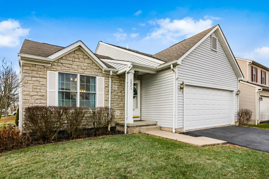 **showings begin 1 pm today, 1/18. Step into this contemporary home and be instantly impressed by the soaring cathedral ceiling that creates a light-filled, captivating entry and great room. The open floor plan is perfect for both everyday living and entertaining, with beautiful laminate flooring that flows seamlessly into the dining area and offers easy access to the rear patio for indoor-outdoor enjoyment. The remodeled kitchen is the heart of the home, featuring crisp white raised-panel cabinetry, a center island ideal for gathering, and newer stainless steel appliances (2018), including a smooth-top electric range, dishwasher, microwave, and refrigerator. A highly desirable first-floor laundry adds everyday convenience, while the main-level primary suite offers a peaceful retreat with a walk-in closet and an updated private full bath. Upstairs, you'll find two generously sized bedrooms and a full bath, perfect for family, guests, or a home office setup. This meticulous, move-in-ready home is enhanced by neutral painted walls, laminate flooring, and neutral carpeting, creating a warm and welcoming atmosphere throughout. Relax or entertain outdoors on the expansive 28' x 11' paver patio (308 sq ft), an ideal space for summer gatherings, morning coffee, or evening unwinding. The unfinished basement provides over 600 sq ft of additional space, offering endless possibilities for storage or future living space. Completing the package is a new HVAC system installed in 2023, giving peace of mind for years to come.