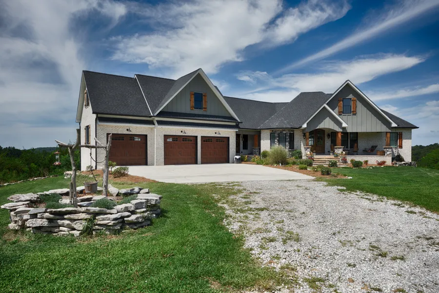 The custom built main house of 5729 square foot home sits atop a hill on +/- 100 acres offering panoramic views of the breathtaking countryside from every window. You wont miss the captivating sunsets, foggy valleys, or rumbling storms rolling in off the back deck, nor will you miss the beautiful sunrises off the front porch. The main level is customized farm charm, featuring over 3,500 square feet of living with 4 bedrooms, 2.5 baths, dining, eat-in kitchen, great room sunroom, and pantry. The main level also exhibits 3/4 white oak floors and custom plantation shutter/ blinds throughout, a great room with 17 cathedral ceilings (shiplap), solid cedar beams, brick columns, stone fireplace, gas logs and a solid walnut mantle; an eat-in kitchen with solid custom maple cabinets, double ovens, gas stove, quartz counters, low voltage upper and lower cabinet lighting, coffee bar, beverage frig, large pantry, etc., a large dining room with bay window, a large master suite with tray ceiling, bed-side wall lamps, built-in cabinets, and walk-in his and her closets; a large master bath with 48 vanity (hers), 36 vanity (his), iron claw-foot tub, bead-board wall accent, large shower with dual rain/spray heads; a sunroom with 15 shiplap ceilings, solid cedar beams and brick side wall, large attic for storage, spray foam insulation throughout house for tremendous heating and cooling efficiencies, black Andersen 400 clad series windows, dual American Standard HVAC units and separate mini split in sunroom.