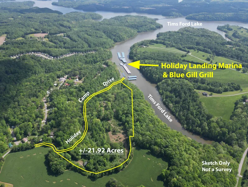 SELLING IN ONE TRACT! 21.9 acres on Tims Ford Lake with direct access to Holiday Landing Marina. This property joins TVA/Tims Ford Lake and is also adjacent to Holiday Landing Marina. It is the former site of a campground that was in operation many years ago. There is an old bathhouse on the property and the old campsites had electric and water hookups. Current zoning for the property is R-1 Single-Family Residential, and the property has over 1,700 of road frontage along Holiday Camp Drive. City water and power are available to the property. This land could be developed into single-family homesites, or it could be used as another campground with proper re-zoning, or it could be a great location to build your dream home with direct access to one of the most popular marinas on Tims Ford Lake. It is impossible to measure the true potential for this property! OPTION TO PURCHASE BOAT SLIP LI...