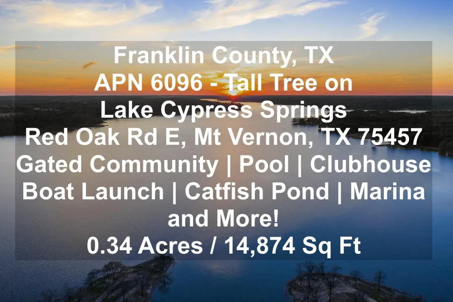 Welcome to the calm beautiful getaway spot in the heart of Mount Vernon, Franklin County, Texas. Situated steps away from the many amenities including a private clubhouse, boat trailer storage, swimming pool, tennis/basketball courts, pickleball court, boat launch, catfish pond and marina, and Overlook Park. Take walks among the majestic trees as you enjoy the peace and quiet that this lake community has to offer. Popular getaway due to 100 miles from Dallas. Build your vacation spot, your future home, or investment opportunities in the highly desirable gated subdivision of Tall Tree.