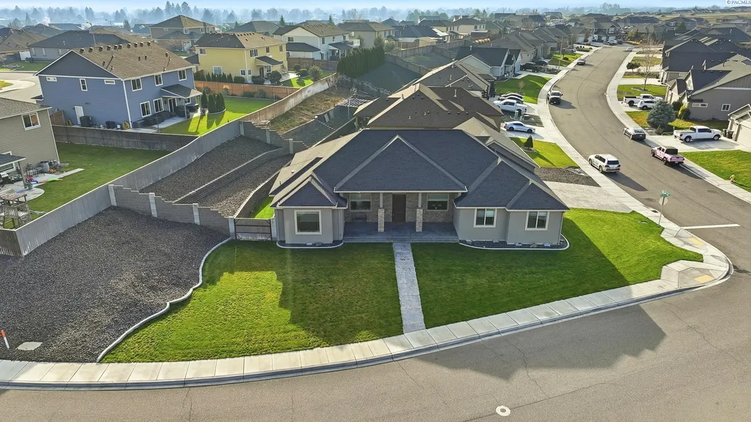 MLS# 286365 Why buy new when this stunning 2018 custom-built home has it all? Located on a .34-acre corner lot in desirable West Pasco, this beautifully upgraded rambler with bonus room offers style, space, and comfort. The exterior features stucco with stone trim, professional landscaping, and stamped concrete. Inside, enjoy an open floor plan with soaring ceilings, abundant natural light, and luxury vinyl plank flooring throughout the main living areas. The gourmet kitchen includes quartz counters, tile backsplash, stainless appliances (double oven!), and soft-close cabinets. The spacious living area with a stone electric fireplace flows into the dining space, perfect for entertaining. Step out to the impressive covered patio with tongue-and-groove ceiling, outdoor speakers, and stamped concrete—ideal for gatherings. The fully fenced backyard offers privacy and beauty. This home includes 4 bedrooms + a large bonus room (optional 5th), 3 full baths, and a private primary suite with huge walk-in closet and a luxurious custom shower with 3 shower heads. Quality upgrades: 50-year roof, solid-core doors, custom blinds, soundproof interior walls, and a 5-ton high-efficiency HVAC.