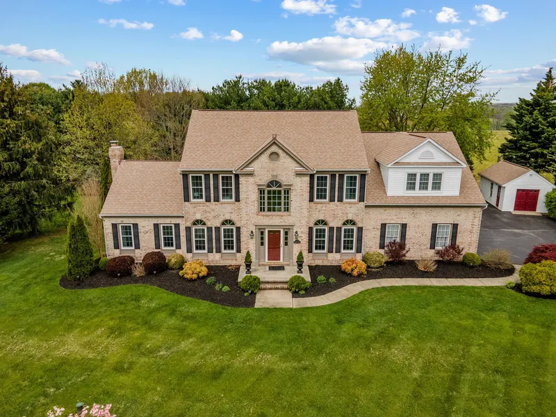 Updated Price! Meticulous 4BR/2.5BA colonial w/ private backyard oasis/gardens all set on a quiet cul-de-sac. This home has a cook's dream kitchen w/ Marsh cabinets, GE Profile S/S appliances, pantry, abundant counter space and more. The bright and airy main floor features vaulted ceilings, natural light which floods in from the skylights, a fireplace, immaculate hardwood floors, dining area, laundry room and more. A spacious primary suite is featured on the upper floor and has a SPA bath, large walk-in closet, vaulted ceiling and a ton of natural light. Additionally, there are three bedrooms and a full bath. Entertain outside on the large deck and enjoy the evening sun with a retractable awning while overlooking a serene pasture. An unfinished basement lends to amazing potential with a three-piece rough-in ready for an additional bath. Home has a 2 car side-load garage and additional detached garage space. Ideally located in a small enclave of custom built homes w/ +1 acre lots and has ease of access to Hwys. 27/70/270.