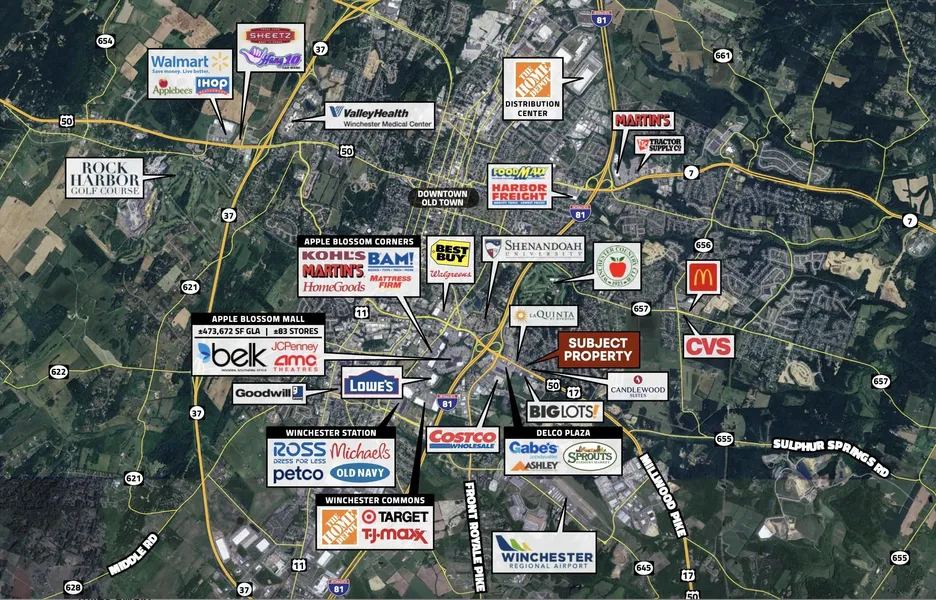 Highly visible 1.38 acre parcel (200’ W x 300’ D) overlooking a diverse retail area including Costco. A geotechnical report and Phase 1 environmental are available along with a full ALTA survey. Strong commercial hub with a mix of retail stores, restaurants, and service-oriented businesses. This variety produces a broad customer base and generates daily traffic to the immediate area. The site is located on a heavily used Millwood Pike with convenient access to Interstate 81. Daily traffic on this portion of Millwood Pike is 21,000 vehicles making it one of the top roads in the market. Winchester is one of the fast growing metro areas in the Commonwealth of Virginia with population growth projected to increase 12.7% over the next decade. Along with Frederick County, Virginia, the metro area is one of the fastest growing in the Commonwealth of Virginia. The city’s employment landscape spans various sectors, offering private sector jobs in agriculture, forestry, manufacturing, retail, professional services, education, and healthcare. The leading employer, Valley Health Systems, operates the Winchester Medical Center—a non-profit, regional referral hospital and Level II trauma center that serves the tri-state region.