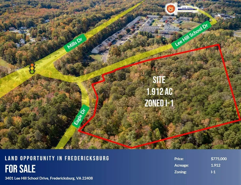 3401 Lee Hill School Drive presents a rare opportunity to acquire 1.912 acres of Industrial (I-1) zoned land strategically positioned in the heart of the fast-growing Spotsylvania / Fredericksburg market. Located just moments from Interstate 95 at Exit 126, the site offers exceptional access to regional and interstate transportation networks and is situated less than300 feet from Route 17, a major commercial corridor. The property benefits from corner frontage along Lee Hill School Drive and Eagle Drive, enhancing visibility, ingress/egress options, and future development flexibility. The parcel is mostly level and wooded, reducing site preparation costs and enabling a more efficient development timeline.