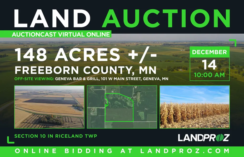LandProz is pleased to present the Medd Family Farm in Freeborn County, MN. This tillable land will be offered to the public to bid their price via LandProz AuctionCast on our website and on site at the Geneva Bar & Grill.