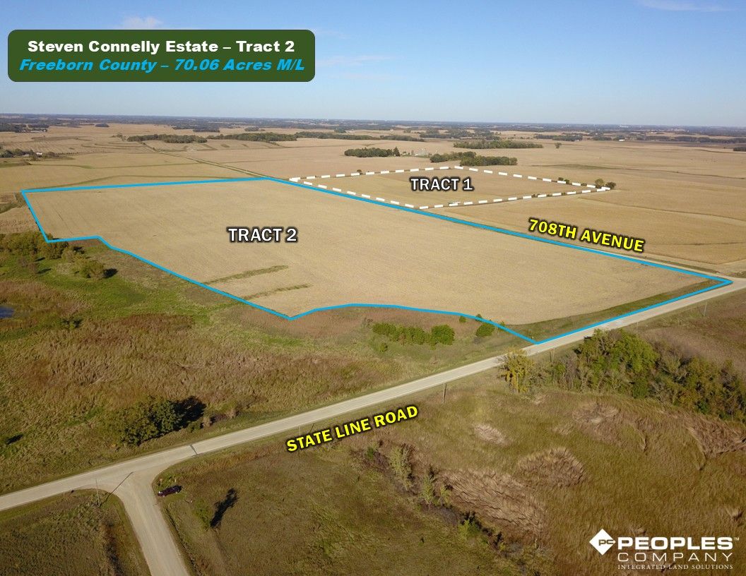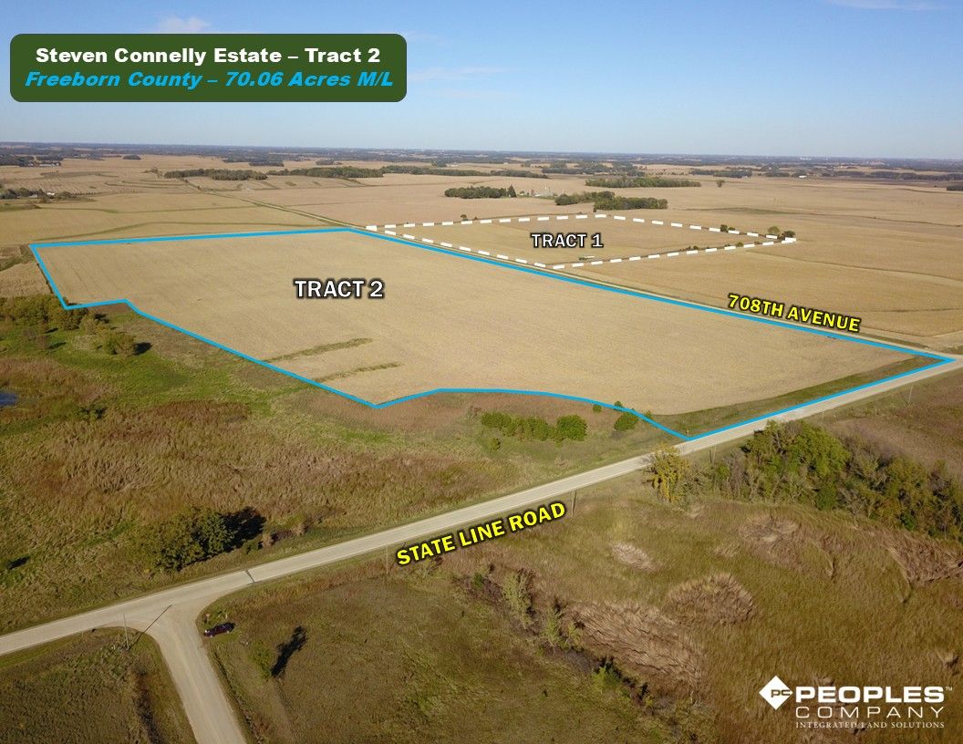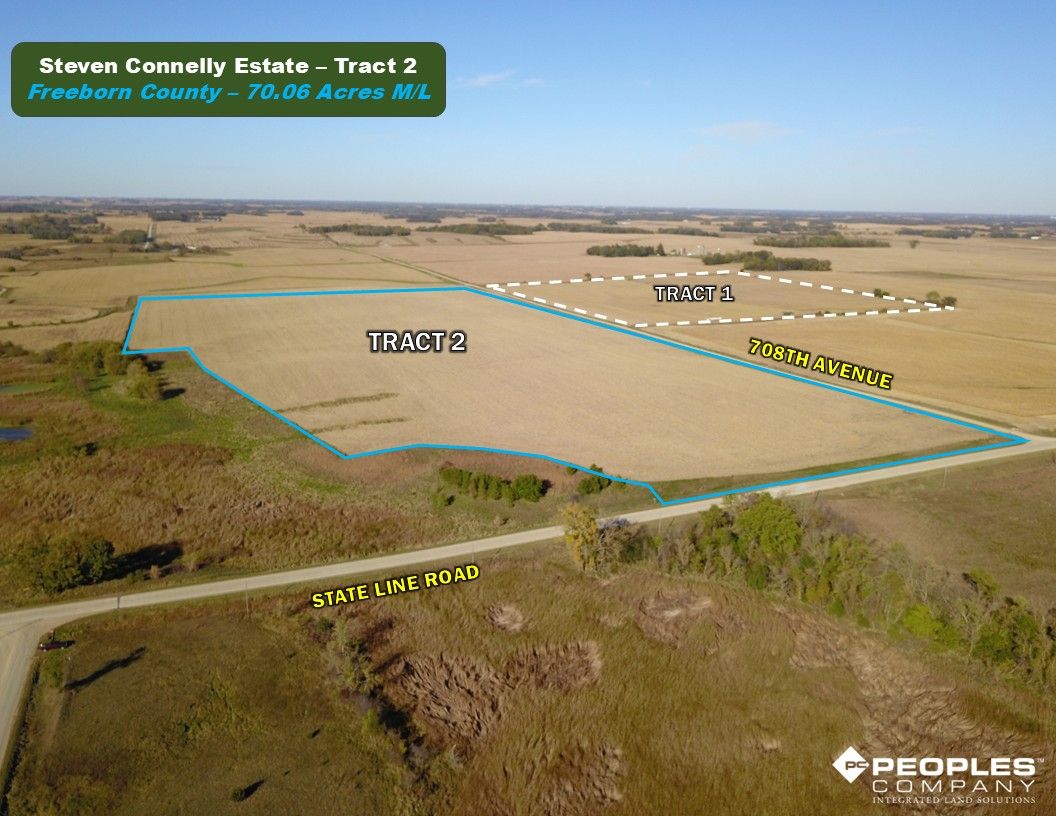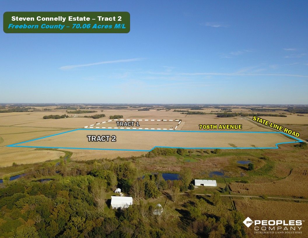 Freeborn County, Minnesota Farmland Auction Mark your calendars for Tuesday, December 2nd, 2025, at 1:00 PM! Peoples Company is pleased to represent the Steven L Connelly Estate and the Connelly Family with the sale of Stevens farm located just east of Emmons, Minnesota. The portfolio consists of 109.6 acres m/l that will be offered as two individual tracts via public auction utilizing the Buyers Choice auction method. These nearly 100% tillable tracts include 107.88 m/l cropland acres and an average CPI soil rating of 84.5 with primary soil types of highly productive Hamel loam, Minnetonka silty clay loam, and Lester Loam. These tracts are located in Section 34 of Nunda Township in Freeborn County, Minnesota.
