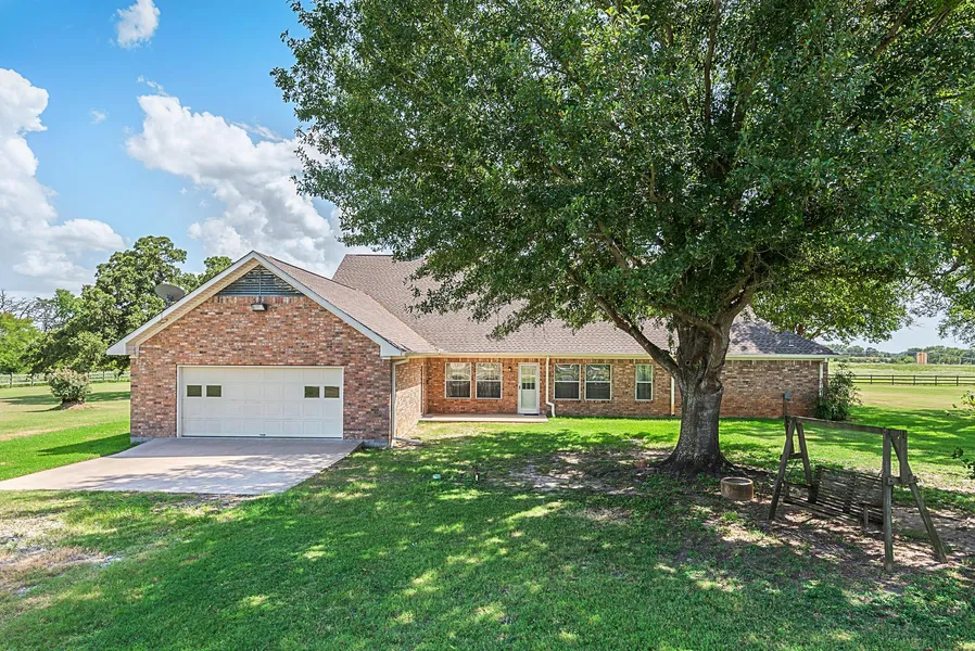 The main house is brick on slab with approximately 3853 sq.ft. and has 4 bedrooms, 4 baths and attached oversized 2 car garage. Entering the house from the garage you will find 9 ceilings and tiled floors linking dedicated mud room, laundry, full bath, and kitchen. The bright laundry room has built in storage including ironing board, large sink, and lots of counter work space. The full bath just off the kitchen has a large vanity, shower, separate water closet, and generous built in storage. The sunny kitchen has lots of built in wood cabinets, counter space all around, two ovens, and a work island with stove top. There is a large 5 by 9 walk-in pantry with floor to ceiling shelves. A bar-seating counter separates the kitchen from a casual dining area that looks out on the spacious front lawn with large trees, Martin and Blue Bird houses, and a pastoral view.