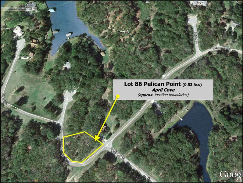 Research Parcel InformationS 287 to RGT on FM 488, RGT on FM 416, RGT into April Cove, LFT on April Cove, LFT on Pelican Pt. Property on RGT