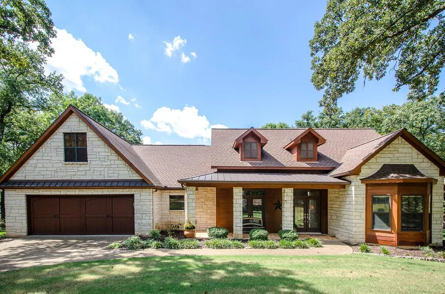 Waterfront lake home nestled among lots of mature trees & located on 1.6 acres with approx 103 feet of waterfront on protected cove with steel retaining wall, single lift boat house with jet ski lift and storage closet. Home features study with wall of built-ins and french doors out to front porch; vaulted ceilings in living room with floor to ceiling stone gas fireplace; large master suite with his & her vanities, garden tub & tiled shower. Secondary bedrooms with jack n jill bath & large bonus room upstairs. Oversized kitchen with granite, gas cook top and tons of cabinet space, breakfast bar and open to breakfast area with lake views.