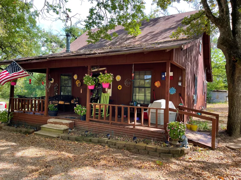 Just off of I-45 near Dew on a non-thru road is this cozy 2 bed, 1 bath, story & half on approximately 11.31 acres. The land is shaded by many mature trees and Caroline Creek runs through the middle. A large pond is near the house & visible from the covered front porch. Nice privacy paired with the convenience of being near I-45. Centrally located between Dallas and Houston. Open living rm with eat in kitchen, refrigerator included, laundry room with full size washer & dryer area right off the kitchen for added convenience. Bathroom with tub & shower combo, Upstairs is a large room with window seat that would be a great 2nd bedroom or office. The back porch has been enclosed for additional living space for an office or guest room. Detached 2 car metal garage with exteri...