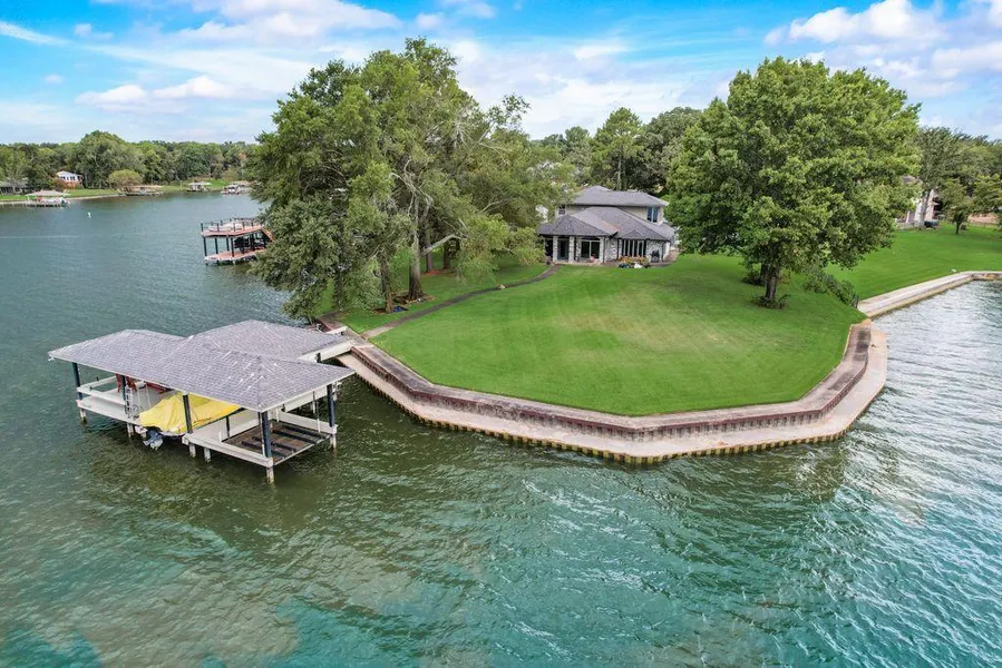 Panoramic open water views from this rare unique point location! This waterfront retreat boasts some of the best views on Richland Chambers Lake. This 4 bed, 3 bath home features open living spaces which transitions seamlessly into the spacious kitchen. The primary suite offers more open water views with the airy ensuite bathroom creating an oasis of relaxation. Upstairs you'll have tons of flexibility with an upstairs living space & 2 bedrooms that can be used as an office space, or bonus rooms, plus another full bathroom! The 3 car garage is perfect for stashing away vehicles, lake toys or lawn equipment keeping everything protected & tidy. The expansive back patio is great for BBQs or drinks & a meandering path takes you down to the water. The lake beckons from every angle of this property with 180 degree views & 185ft of shoreline with steel retaining wall. Your own private boat house with 2 lifts will launch you straight on to open water. Come explore all that lake life can offer!