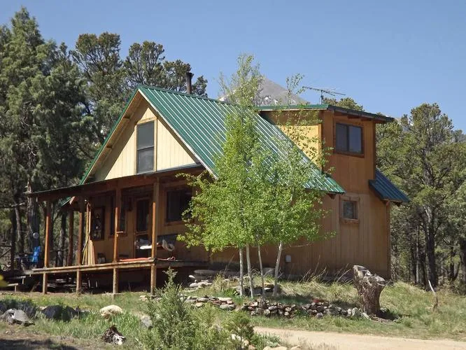 Custom one bedroom one bath 720 SF cabin nestled below the Twin Sisters of the Sangre De Cristo Mountain Range. This custom cabin has a full bedroom loft with outside balcony, full bath with laundry room, detached garage, and workshop. Stay warm with an air tight wood stove, pellet stove, and propane wall furnace. The front outside sitting porch has a swing overlooking the valley. The one of a kind kitchen sink is designed from an antique buffet. 3.08 acres of diversified forest trees. Beautiful mountain cabin setting!