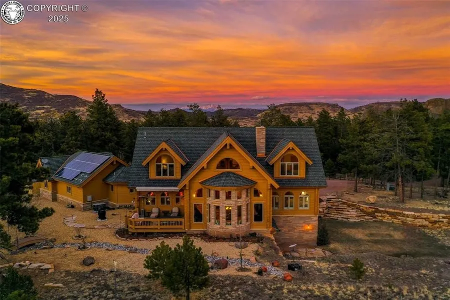 Immerse yourself in the beauty & tranquility of this extraordinary mountain home, tucked away in a gated community only 45 min outside Canon City. Blending sophistication & nature, this stunning sanctuary will leave you in awe! From the moment you enter, the soaring ceilings & striking accent beams create an atmosphere of rustic elegance. This masterpiece is constructed from premium custom-engineered logs, blending timeless charm with modern functionality. In the heart of the home, the adjoined kitchen, dining & living areas are perfect for gathering. The exquisite travertine flooring, enhanced by rich cherry wood inlays enhances the warmth & refinement of the space, while expansive custom windows frame breathtaking panoramic views from every room & seamlessly blending the indoors with your surroundings. The main floor primary bedroom shares a double-sided fireplace with the formal dinin...