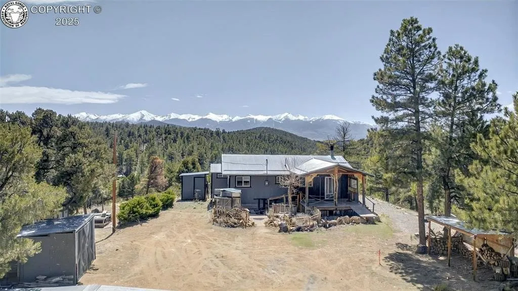 Quaint little mountain cottage with easy access on paved mountain roads yet tucked away for privacy. Set on 3.5 acre pine tree covered lot that would make a great full time living home or long weekends cabin. The breath taking views of the majestic snow capped Sangre De Cristo mountain range from the covered rear deck sitting area are truely unbelievable! Home offers 2 roomy bedrooms, 1 full bath with laundry area, wonderful large open living room with expansive windows and warming wood stove. The kitchen/dining area are nicely appointed with ample counter space and plenty of storage cabinetry and pantries. Home boasts updated windows & flooring, long lasting metal roof and detailed wood interior. Outside are numerious outbuildings including a large RV carport, 10 x 16 shed/workshop with loft, 6 x 8 storage shed and even a root cellar. Great location offering easy access to miles of hiking trails to high mountain lakes & streams, off-road trails, hunting, fishing, winter sking & snowmobiling. Take a short drive to the quaint town of Westcliffe or a mountain pass drive to Great Sand Dunes National Park. 1 1/2 hour drive to Colorado Springs Airport. Property offered at discount price due to encroachment issue, contact agent for details.