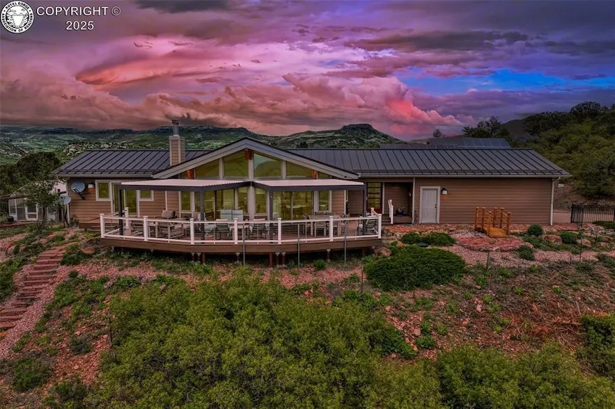 Come home to the Mountains and be at PEACE in this FURNISHED STUNNING SANCTUARY on 35 acres with INSPIRING VIEWS of the MAJESTIC SNOW-CAPPED SANGRE DE CRISTOS. The bricked walkway with two water features, stream and fountain gives you access to the front entry door or the beautiful trex deck with louvered covering. The Great Room Concept is so inviting with LIGHT maple flooring, vaulted ceilings, and an oversized island with gorgeous granite from which you may enjoy a meal or an adult beverage while you gaze out the full wall of sliding glass doors at the wildlife ie deer, elk, variety of birds and hummers with the 14K peaks and the rolling hills below. The gourmet kitchen is equipped with two pull out dishwashers,electric cooktop, and refrigerator, tons of counterspace and cabinets. Living room has a built in wood burning fireplace and a gorgeous wood beam accent. Step into the spacious master with a walkout to the trex deck and rock steps leading down to the meadows. Ensuite has an extra large shower,granite and access to the cusom walk-in closet. Bedroom 2 has a Murphey bed/ office area with attached jack and jill full bath that leads to the 3rd bedroom. The huge foyer is such a wonderful space to greet guests and the powder room and laundry room with garage entrance are off this space, making it all very convenient. Inside the garage is the the solar system,solar hot water heater and an EV car charger for an electric vehicle. Outside you will find a diesel generator with enough fuel storage to run the whole house for a full week and a powered greenhouse to grow your own fruits and veggies. This home may be purchased with 35 acres or add an additional 35-105 acres to your paradise. There is additional parking in the back for guests or an RV or shop. This home is only 25 minutes from Canon City and an hour and 15 minutes from Colorado Springs and minutes from miles of government lands.