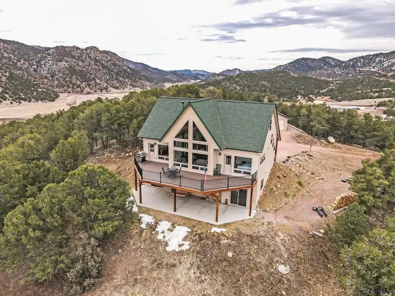 This custom-built home offers an idyllic retreat with the year-round Currant Creek meandering through the property, inviting you to cast your fly into one of the numerous ponds or observe the playful beavers. The home exudes elegance featuring solid hickory doors, a kitchen with solid hickory cabinets, porcelain floors, stainless steel appliances and solid surface counters. Enjoy year-round comfort with heat/AC, along with a wood-burning stove. The master bedroom is a sanctuary with 360-degree views, walk-in closet, and a luxurious bathroom boasting a soaking tub and walk-in shower. Additional accommodations include a 2nd main-floor bedroom and a third bedroom upstairs. The loft space can serve as a separate living area, office, or rec room. The heated partially finished walk-out basement offers limitless possibilities, featuring a giant laundry room w/ a large pantry closet that could easily double as a fourth bedroom, and a convenient 3/4 bathroom. Outside, the expansive Trex Deck and concrete patio provide a perfect place to admire the surrounding mountains, with propane hookups facilitating effortless outdoor cooking. The home is equipped with wiring for a generator. The detached 32x32 garage offers ample space for vehicles and storage, complete with solar power. The well report shows 10 GPM! Located in GMU 58 for excellent hunting, 20 minutes to town, 15 minutes to world class fishing, 1.5 hours to Breckenridge or Monarch