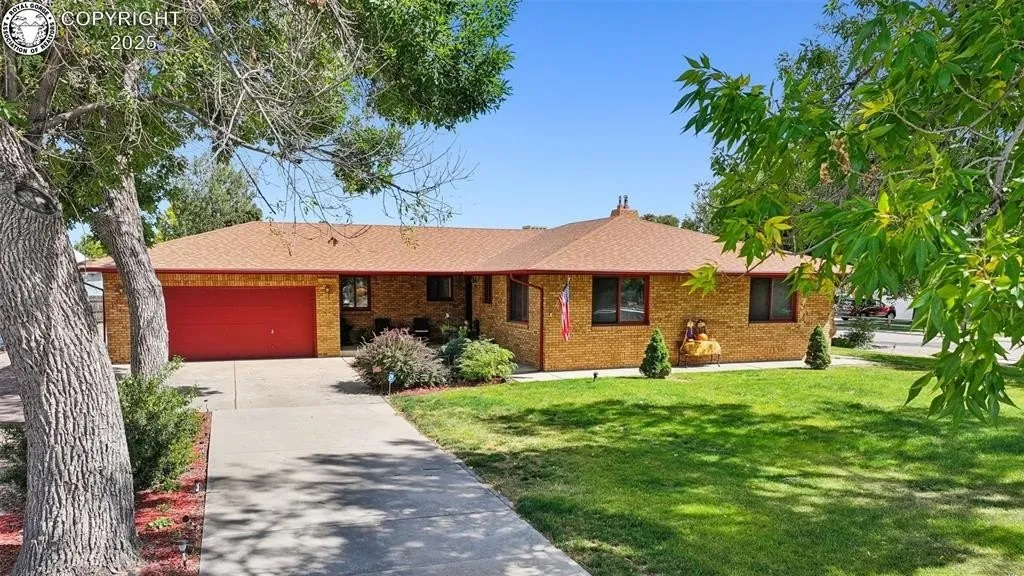 This home has to be a drive-by that someone says "If this home ever goes for sale"... Home has always been decorated to the hilt, corner lot, solid brick home, beautiful mature trees, landscaped front and back and a 2nd entrance to the property. Lots of parking, an area with corals (no guarantees as to number or limits of horses allowed on the property. Property has an attached two car garage and a detached four car garage. (A man's dream!) There is an attached sunroom that can be entered from the back yard or can be entered from the dining room sliding glass door. This property both inside and out has been manicured to be ready to sell. To help with the exterior landscaping and greenery, there is one (1) share of Oil Creek ditch stock. As you approach the home, there is a nice covered front porch. As you enter there is a nice foyer area that is carpeted, as well as the living room, hallways, and bedrooms with brand new carpet. The kitchen, dining room, hallway to laundry room and laundry room all with new luxury vinyl. The kitchen dining area has been repainted and the exterior trim has also been repainted. The ambiance in the living room increases with a nice warm fireplace with accented brick wall with built-in area for you're little collection. 960 sq. ft basement can offer extra storage. Come visit this one-of-a-kind property with all the fixings. You and your family can be moved in by Christmas! Call for your personal showing today.