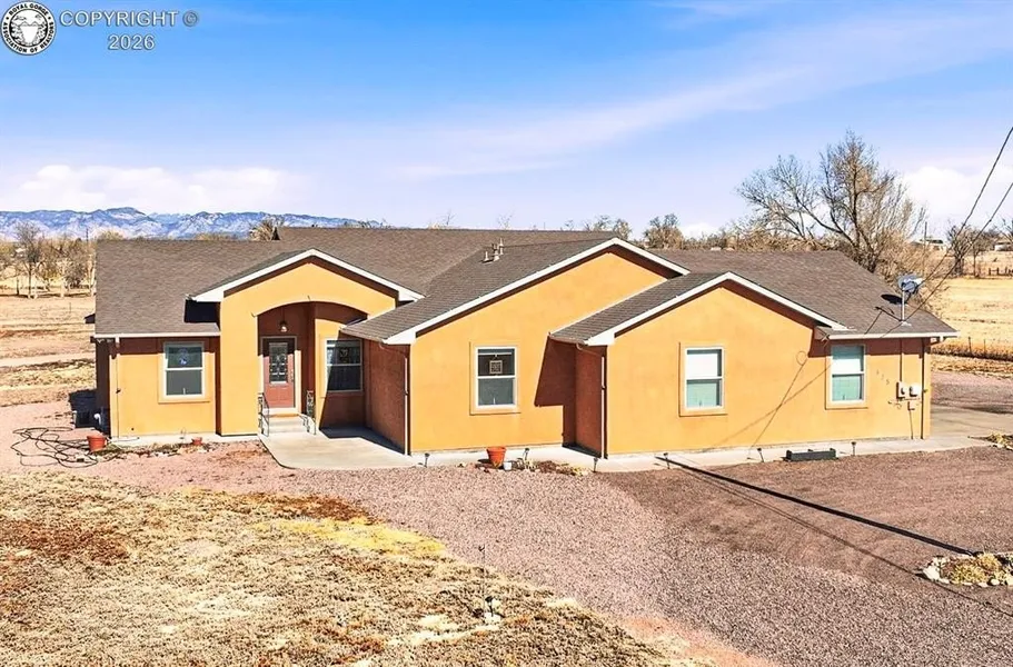 Quality custom home on over 4.4 acres offering peaceful rural living and exceptional privacy, perfectly positioned back from the road. This inviting 4-bedroom, 2-bath home features over 1,950 square feet of thoughtfully designed living space with quality upgrades throughout. A bright, formal entry welcomes you into the expanded living room, highlighted by a beautiful gas-log fireplace, vaulted ceilings, and large windows that fill the space with natural light. The oversized custom kitchen is designed for both function and style, featuring a large prep and seating island, quality custom cabinetry, and a spacious pantry. The open dining area easily accommodates large tables, making it ideal for big gatherings and entertaining. A desirable split-bedroom floor plan offers a spacious primary suite complete with a luxurious 5-piece bath, including large, inviting soaking tub, beautifully tiled walk-in shower, double vanity, and an impressive walk-in closet. The three additional bedrooms feature vaulted ceilings, large closets, and flexibility for those that work from home to have a private office or work space. Car and hobby enthusiasts will appreciate the attached 29 x 29 three-car garage, plus a detached 30 x 48 shop with full concrete floor, 11 1/2-foot main overhead door, and additional side-entry overhead door. An extra 20 x 30 garage provides even more storage and workspace options for tractors and off-road vehicles. All of this sits on a level, fenced 4.4 acre parcel-an attractive and functional property with room to spread out and enjoy the quiet country setting with expansive mountian views of Pikes Peak and the surrounding mountain ranges. Wonderful Property!