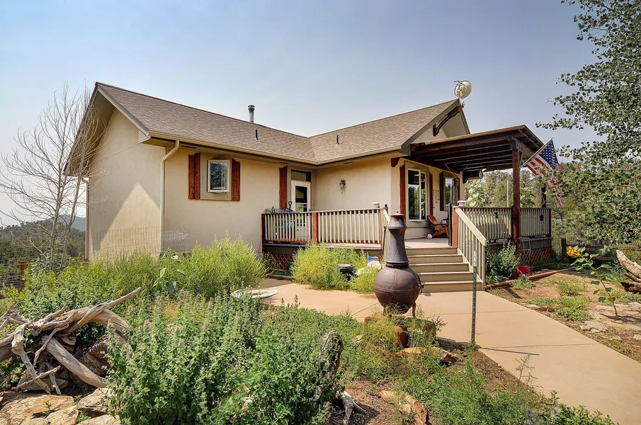 2699011 Custom built Mountain Home located on 20 private acres surrounded on two sides by public land. Beautiful mountain range views, red rock and trees make this all about the nature of Colorado. The home was built originally as the builders personal home and boasts an open floor plan with vaulted ceilings, two bedrooms, 2 baths on the main level and one bedroom, family room and master bath down. A master bedroom set up on each floor gives you a choice. The front deck is a great place to relax and the back deck with views of the mountain ranges is a great place for the sunrise and sunsets. Great places to hike around or ride your horses on the property and directly onto the public land from the property. The home and property are off grid and function on a full solar system, propane and a back up generator. The four car detached garage features its own separate solar system. The property has plenty of fencing, a small horse barn with hay storage, chicken coop and excellent green house to grow your vegetables. If you are looking for peace and quiet, views, star gazing and privacy, this is the home for you. By appointment.