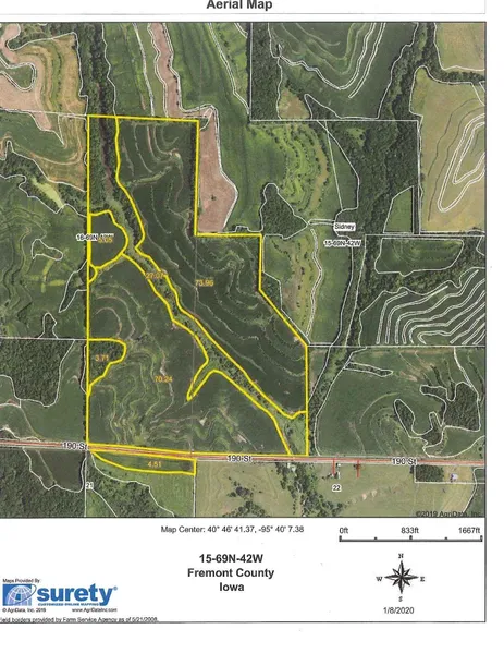 This Fremont County, Iowa farm is located 1 mile North and 1/2 mile West from Sidney, Iowa. The farm consists of 191 taxable acres. FSA shows 153.76 cropland acres. CSR 2 is 59.5 average. Priced at $5104.71 per acre. Good combination crop/recreation farm located 40 minutes Southeast of Omaha EXCELLENT HUNTING!! Possession for 2020 is negotiable. Seller is will to lease back.