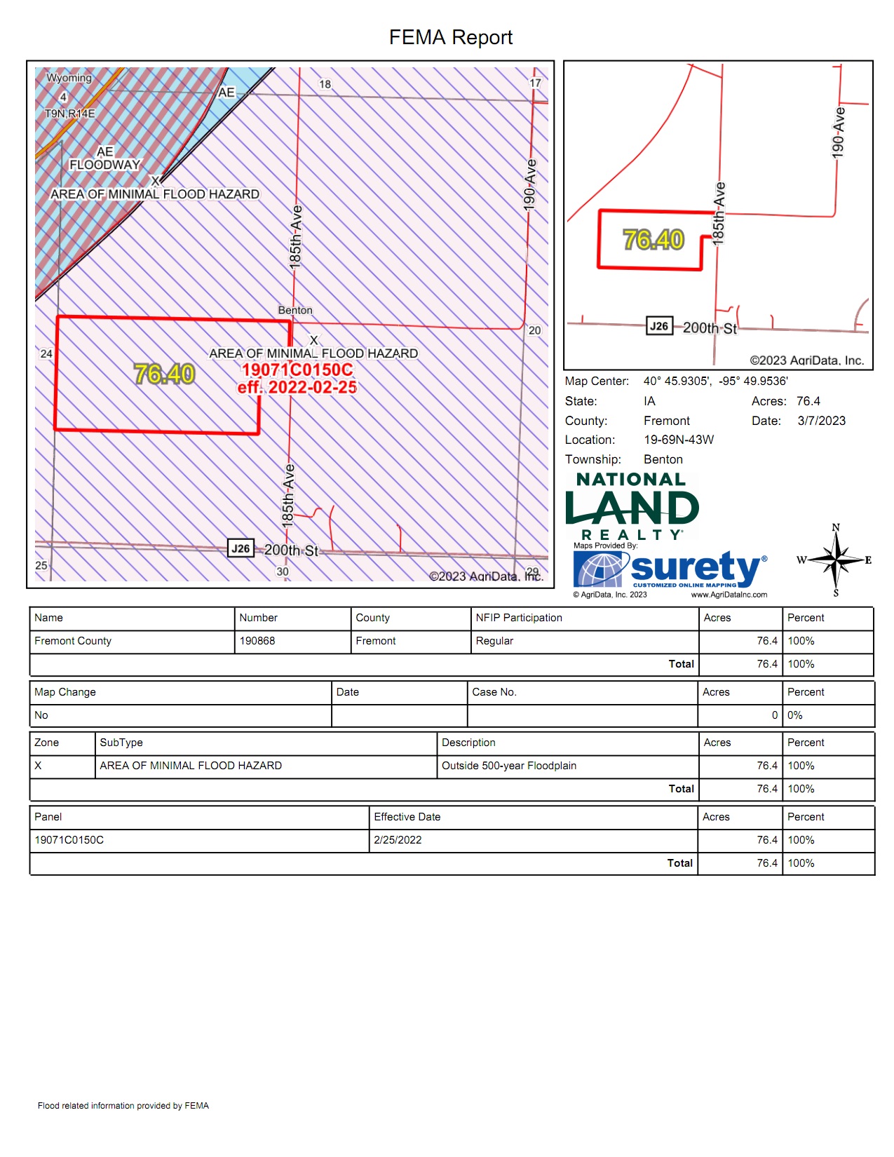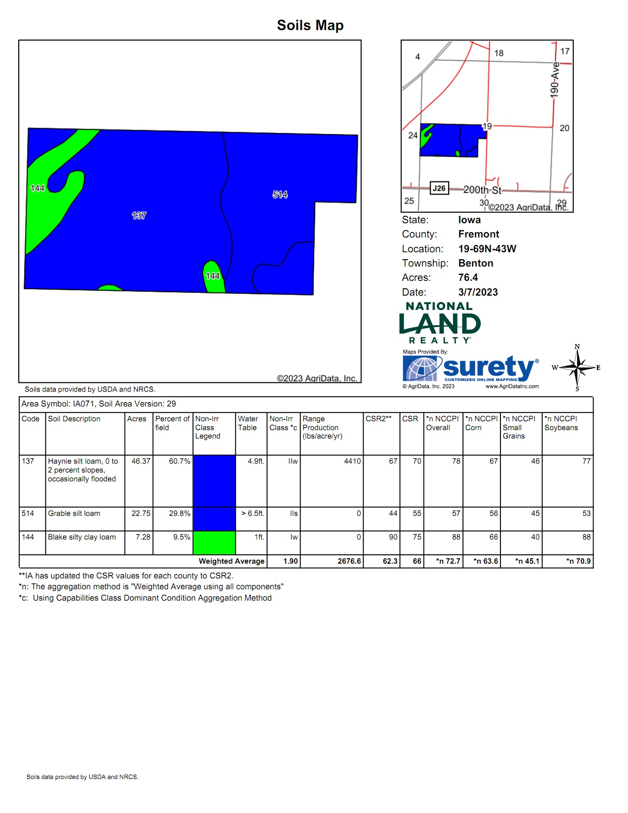 This is the quintessential river flats farm! Tillable from edge to edge, 75.97 +/- taxable acres (Beacon) and 76.4 +/- certified tillable acres (Surety). This highly productive Missouri River bottom farmland, located just outside of Percival, IA, offers an easy route to market your harvest. Roughly 1/2 mile from I-29, which connects this farm to grain elevators in Nebraska City, NE (10 miles), and Hamburg, IA (16 miles).