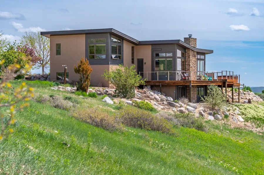 Additional amenities and extras include in-floor radiant heat with hot water gas boiler system, air conditioning wall unit, on-demand hot water heater, lower level mechanical room, wine cellar/food storage room, stucco exterior, newer roof, natural xeriscape landscaping, stainless steel deck railing, insulated concrete form construction with helical piers, and a unique roof rainwater capture system for water collection and efficiency.