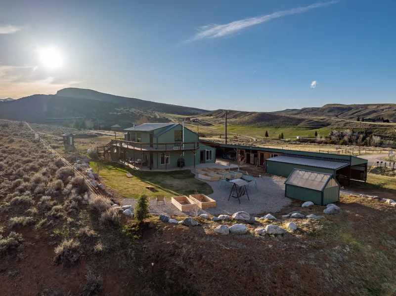The well insulated and highly efficient two story barn-style home boasts 1,968 finished sq. ft., 2 bedrooms, 2 baths, an en-suite primary bedroom on each level, open kitchen, dining and living area perfect for entertaining and taking in the stunning 360 degree views, separate living areas on each level, a bright and spacious laundry room and workout/yoga area on the main level, a beautiful entryway area/mud room with ample space for coats, boots, and gear, and countless high quality custom features and craftsmanship throughout the home, including custom woodwork, lighting and built-ins, bamboo flooring, tongue and groove vaulted wood ceilings, live-edge wood countertops, large transom windows, wall-mounted fireplaces providing warmth and ambiance, a cozy wood burning stove, bonus loft bed area, and a wraparound upper level deck and covered patio on the south, west and east sides of the home, ideal for enjoying the idyllic Lander summer mornings and evenings.