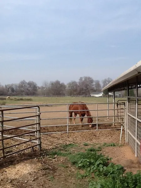 Horse barn with six stalls, kitchen, office and food storage. Also includes two large covered and corralled horse areas. Entire pasture is fenced.