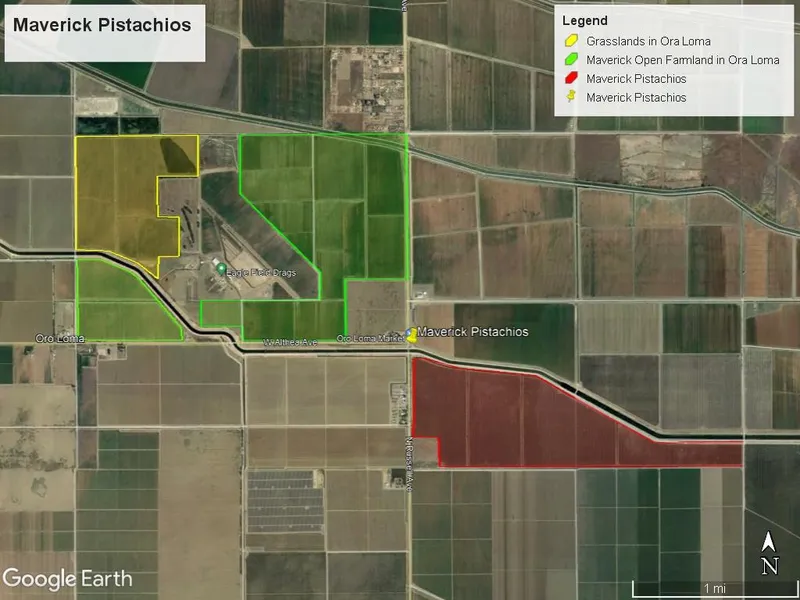The property has three land uses: 465.87 gross pistachio acres, 751.93 Open Farmland acres, and 286.01 Grassland acres. The total acreage is 1,503.81