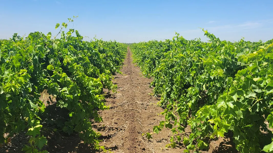 Mature Thompson vineyard with recently installed metal stakes and double crossarms. 30 bottom and 36 top crossarm. There are 4 acres of young Selma Pete vines and approximately 6 acres of open yard area.