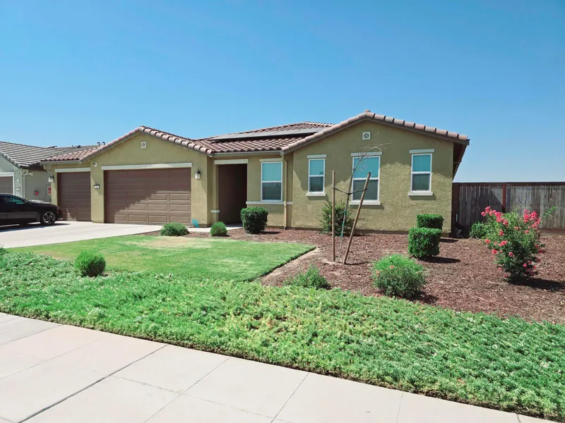 Welcome to your dream home in the serene town of Fowler. This beautiful home, built in 2022, is move-in ready and waiting for you to create lasting memories. Featuring 5 spacious bedrooms with high ceilings and 2 modern bathrooms, this home offers ample space for your family to thrive. As you enter, you are greeted by a long hallway that leads you to the heart of the homethe family room. The open floor plan seamlessly connects the kitchen, dining area, and living room, making it perfect for hosting gatherings and ensuring that everyone remains part of the festivities. The kitchen boasts stunning granite countertops, stainless steel appliances, including a microwave, dishwasher, and gas stove, and a convenient walk-in pantry. The island serves a dual purpose, providing an ideal space for food preparation and a cozy spot to enjoy breakfast. The primary bedroom is a true retreat, featuring a large window that offers a lovely view of the backyard. The primary bathroom is equally impressive with a walk-in shower, his and her sinks, and a spacious walk-in closet. Each additional bedroom is generously sized, reflecting the thoughtful design and quality craftsmanship of this nearly new home. Step outside to the backyard, where young plants have been carefully planted, promising to grow into a beautiful garden oasis where you can enjoy BBQ under the covered patio. One of the standout features of this property is its fantastic location. The elementary, junior high, and high schools are conveniently situated just outside the subdivision, allowing kids to walk to school with ease. This home also comes with several energy-efficient perks, including solar panels, tankless water heater, insulated three-car garage doors, an Ecobee thermostat, canned lighting, and dual-pane windows, which all contribute to comfort and cost savings.