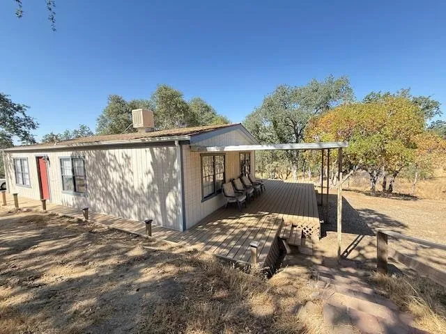 Picture yourself relaxing on the new covered side and back decks while overlooking your beautiful 5 acres and staring at the Sierra Mountains views. Meticulously updated, this move-in ready '89 manufactured home features a permanent foundation for easy financing. Step inside to see all new flooring, cabinets, counters, paint, window coverings, gas stove, vanities, tubs/showers, toilets, sinks, faucets, evaporative cooler and more! The floor plan offers the primary suite on one side and the other two bedrooms on the other, with the living areas in the middle. Large windows allow for natural light and provide the most incredible views. The 5 acres continues to the corner and houses a shed and a kennel, cleared sitting area and plenty of open ground for adding a barn/shop, animal set-ups, etc.