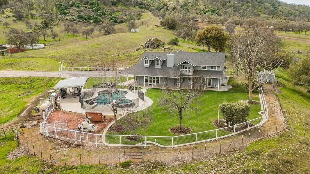 Nestled on 40 acres of picturesque land with sweeping views of the foothills and rolling pastures, this exceptional 5-bedroom, 4.25-bathroom home offers luxury and versatility. The expansive property includes a greenhouse, swing set, firepit, fruit trees, storage containers, a carport/workshop, and is thoughtfully parceled for animal use. The outdoor area is designed for relaxation and entertainment, featuring a pool, spa, and BBQ areaperfect for hosting gatherings or enjoying tranquil evenings. Downstairs, this extraordinary home has 3 bedrooms-one which includes a kitchenette, 2.25 bathrooms-one with easy pool access, a laundry room, and 3 bonus spaces with potential for an ADU. Upstairs includes a master suite and an additional bedroom with a full bathroom and balcony. The expansive master suite features two large walk-in closets, a coffee/wet bar, and an attached balcony overlooking the serene landscape. An adjacent bonus space provides options for an office, gym, nursery, or hobby room. Upon entering the home, you will find a stunning family area with large living room, dining room, and kitchen. The chef's kitchen boasts a large pantry and an additional utility room, providing abundant storage and workspace for culinary endeavors. This unique home seamlessly blends luxury living with functional spaces, all set against the backdrop of natural beauty. Whether you're seeking a private retreat or a versatile family estate, this property offers endless possibilities.