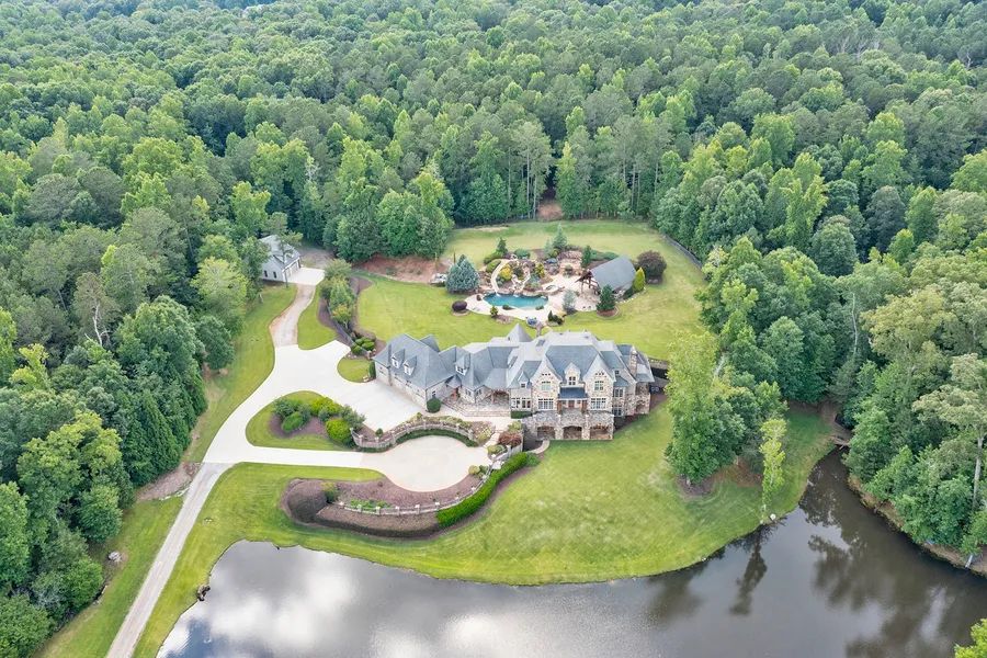 Privacy, luxury, and nature await you at this one-of-a-kind lakefront estate nestled on 8+/- acres in Alpharetta. Drive by the mature landscaping and private stocked lake as you pull up to the receiving court. The spacious floor plan boasts a sunroom with panoramic lake views, a formal dining room, and a gallery with a beautiful custom fireplace flanked by built-in cabinets. Follow gleaming hardwood floors to the gourmet kitchen with top-of-the-line appliances, two islands, a beverage bar, inset cabinets, and a breakfast nook. You will fall in love with the adjacent great room with a high vaulted ceiling, wooden beams, an oversized arched window, a stacked stone fireplace, and a Juliet Balcony. The impressive main-level owner's suite provides two private patios, a fireside sitting room with a breakfast bar, and an oversized spa-like bathroom with dual vanities, a soaking tub, and a shower for two. The terrace level is an entertainer's dream with a game room, full kitchen, living room, guest suite, theater, and home gym. Roam outdoors to the resort-style backyard, which features a fireside-covered patio, a stone fire pit, a gorgeous pool with a built-in water slide, a relaxing spa, a pavilion with a full kitchen/grilling station, and a guest house with a kitchen and suite. Additional features include a convenient elevator to all four levels, six garage spaces, and a secret door through a bookshelf. This private retreat truly offers everything imaginable! Bill Harrison Design and Beecham Builders.